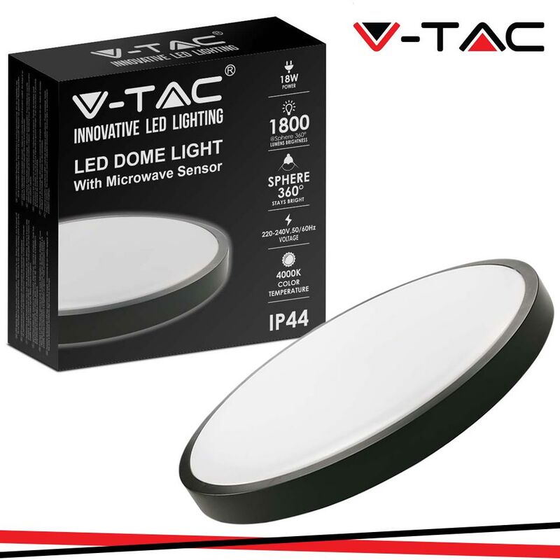 18W LED Dome Light rotondo Microwave Sensor Cornice nera 4000K IP44 SKU: 7669: VT: VT-8618S Caratteristiche del prodotto .80 % di consumo energetico in meno rispetto alle lampadine standard .20 000h di durata .Nessuna emissione di raggi UV .Nessun lampeggio intermittente .Semplice Installazione .Migliore Qualit dei componenti LED .Accensione immediata, nessun tempo di riscaldamento .Resistente a condizioni climatiche estreme (da -20 a + 45 C) Installazione .Parcheggi .Passaggi in grandi aree .Aeroporti .Porti, Centri commerciali, etc.~ Specifiche tecniche ~: Informazione generale = ~:Tipo LED=SMD~:Vitamedia=20,000 ore~: Dati elettrici = ~:Potenza=18W~:Tensione=AC:220-240V~:Frequenza=50/60Hz~: Dati tecnici luce = ~:Fascio Luminoso°=360°~:Colore della luce=Bianco naturale~:Temperatura di colore=4000K~:Flusso luminoso (lm)=1800 lm~: Dettagli corpo = ~:Colore=Nero~:Materiale=PP, PMMA~:Forma=Rotondo~: Funzionalità = ~:Valutazione del IP=IP44~:Sensor=Si~:Tipo