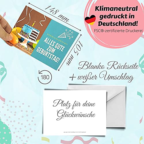 Biglietti postali di alta qualità. I biglietti di compleanno sono realizzati in robusta carta kraft A6 (10,5 x 14,8 cm). Prodotto in Germania e stampato in modo ecologico, certificato FSC (con compensazione di CO2). Per amore del nostro ambiente: i biglietti di compleanno non sono confezionati in una pellicola di plastica
