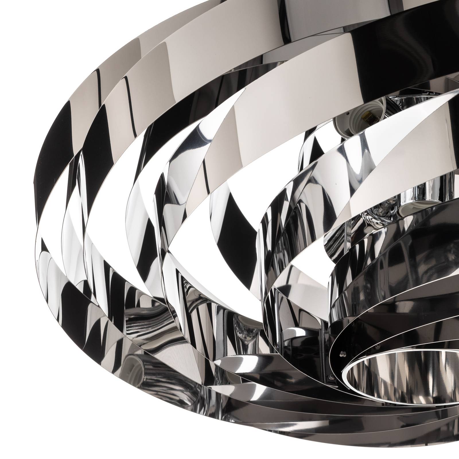 Lampada a sospensione Vento color cromo-nichel per la zona giorno moderna La lampada a sospensione Vento non è solo caratterizzata da un accattivante paralume realizzato con strisce di metallo a forma di spirale, ma si distingue anche per l'emissione di luce particolarmente attraente. Attraverso le fessure del paralume, la luce viene emessa anche ai lati, creando disegni decorativi di luci e ombre sulle pareti. Una fonte di luce per il soggiorno moderno, ideale ad esempio come illuminazione da tavolo.