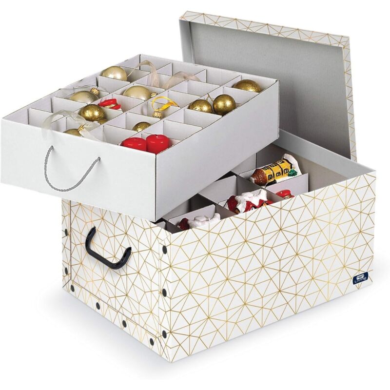 DOMOPAK - SCATOLA NATALIZIA CON DIVISORI GEO ORO 39X50X24CM La soluzione ideale per riporre ordinatamente le decorazioni natalizie, può contenere fino a 40 palle di Natale (24 piccole di max. 7 cm di diametro, 16 grandi di max. 9 cm di diametro). Il vassoio interno è fornito di maniglie per una più pratica estrazione. Modello facile da assemblare.