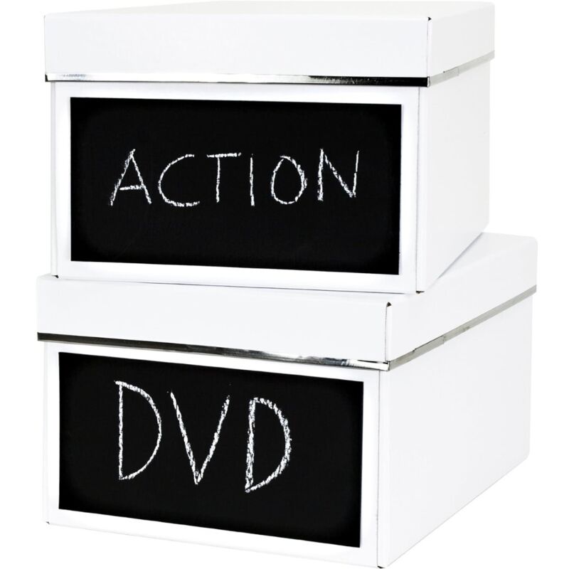DOMOPAK - SCATOLE PORTA DVD BIANCHE Dimensioni: 28,5 x 21,5 x 15 cm Sulla lavagna si può scrivere Fatto di cartone resistente Include una piccola spugna e un trozo di gesso