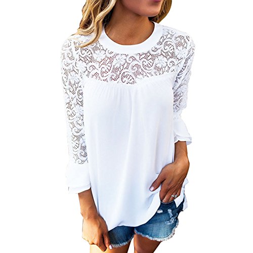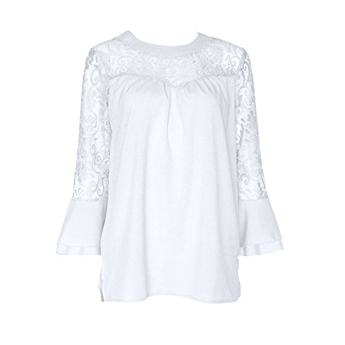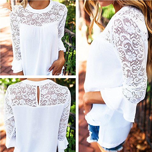Donna Camicia Chiffon Blusa, BAINASIQI T-shirt Maglia Lunga Casual Elegante Pizzo Maniche Camicetta Tops Shirt Ufficio Girocollo (XL, Bianco)