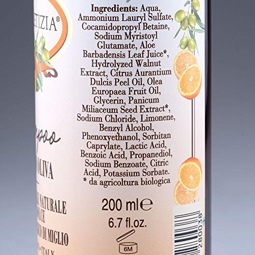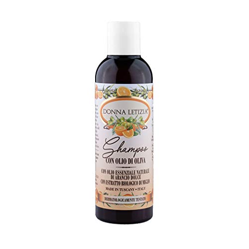 DONNA LETIZIA Shampoo con Olio D'Oliva. Profumato con Olio Essenziale Naturale di Arancio Dolce. Shampoo per Donna, Uomo e Bambini. Dermatologicamente Testato 200ml Made in Tuscany