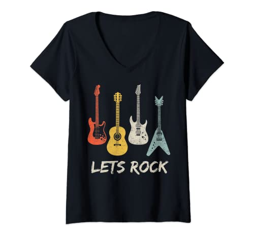 Donna Lets Rock Rock n Roll Guitar Retro Gift Men Women Shirt Maglietta con Collo a V