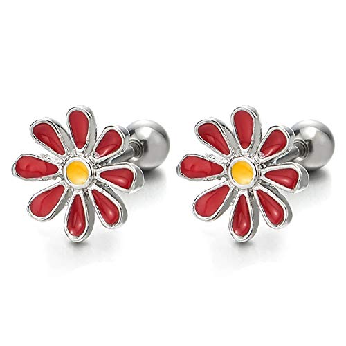 Donna Ragazze Margherita Fiore Orecchini con Rosso Giallo Smalto, Orecchini a Lobo, Acciaio, Riavvitare, Estivi