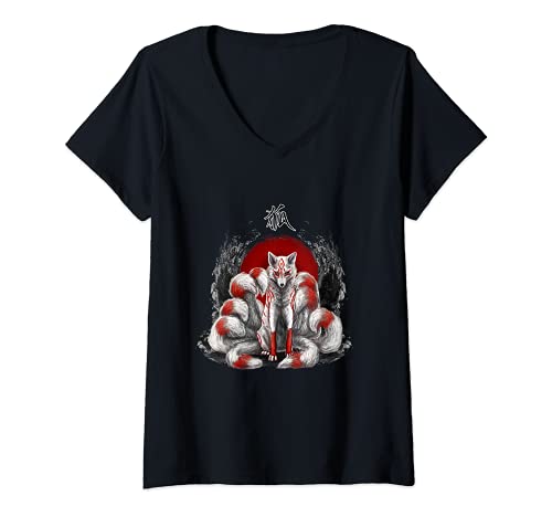 Donna Volpe a nove code giapponese Kitsune Maglietta con Collo a V