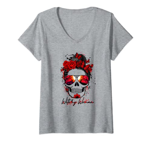 Donna Witchy Woman Skull, Cool Halloween Party Maglietta con Collo a V