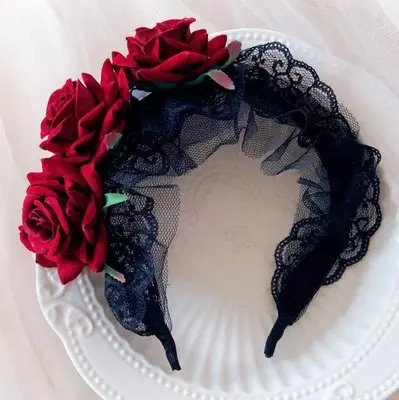 Copricapo cosplay di Halloween: 3 decorazioni fatte a mano di rosa. Motivo a cerchio con testa gotica domestica: il pizzo nero avvolge tutto il cerchio. Regina modello corona strega: i fiori circondano la corona centrale, schiena è elastico. Motivo a cerchio con rosa: decorazione rosa rossa.