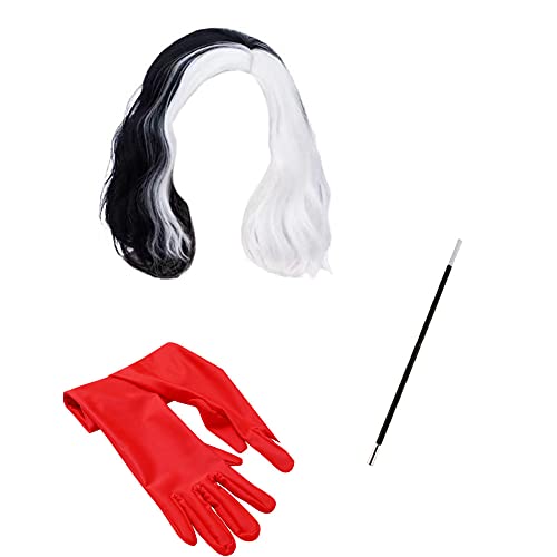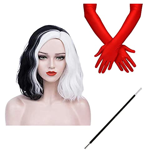 Look eccezionale: costume da donna crudele con parrucca bianca nera, Colore misto bianco e nero, più alla moda e alla moda. Guanti rossi sopra la lunghezza del gomito, adatti alla maggior parte delle persone. la collana è una perla finta, il portasigarette finto è progettato con un'asta di plastica con un terminale metallico e un inalatore di plastica bianco rimovibile. Leggero, comodo da trasportare. Le ricche forniture di costumi ti permetteranno di goderti il tempo dello spettacolo.