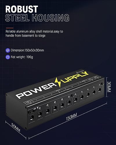 Multi-output isolati - ci sono 10 uscite isolate a scelta - 7 uscite di 9V 100mA, 1 uscita di 9V 500mA, 1 uscita di 12V 100mA e 1 uscita di 18V 100mA. 10 cavi sono anche inclusi nel pacco.