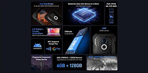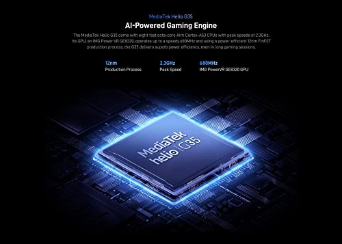 ★【MediaTek Helio G35, motore di gioco con intelligenza artificiale:】MediaTek Helio G35 è dotato di otto veloci CPU Arm Cortex-A53 octa-core con velocità massima di 2,3 GHz. La sua GPU, una IMG Power VR GE8320, funziona fino a 680 MHz e, grazie a un processo produttivo a 12 nm FinFET ad alta efficienza energetica, il G35 offre una straordinaria efficienza energetica, anche durante le lunghe sessioni di gioco (6GB+128GB, supporta una scheda SD esterna fino a 512GB).