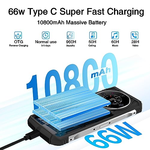 【66W Ricarica Rapida + 10800 mAh Batteria】Lo rugged smartphone DOOGEE S110 dotato di una batteria da 10800 mAh, con un'autonomia in standby di 30 giorni . Dotato di rugged smartphone a tripla difesa con ricarica rapida da 66W, la batteria da 10800 mAh può essere caricata al 55% in 30 minuti, il telefono indistruttibile soddisfa le esigenze quotidiane di lavoro e intrattenimento. Telefono indistruttibile abilitata OTG che supporta la ricarica di altri smartphone rugged elettronici