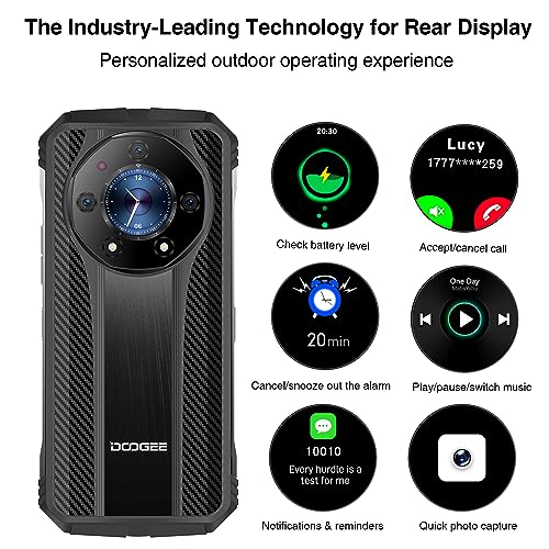 【Display Secondario Intelligente】 Il rugged smartphone DOOGEE S110 4G presenta un design di alta qualità con un lussuoso display elettronico ottagonale incorporato nella parte posteriore. La forma di questo telefono indistruttibile imita quella di un orologio meccanico che visualizza l'ora. Scorrendo lo schermo secondario, è possibile passare alla bussola, alla riproduzione musicale, alla connettività Bluetooth, attivare le applicazioni senza sbloccare il rugged smartphone a mani libere