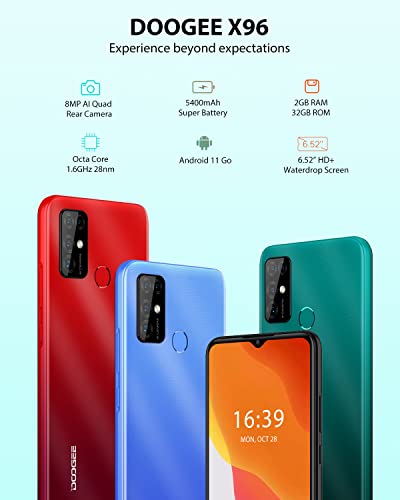 DOOGEE Smartphone Offerta X96, Android 11 Cellulari Offerte, 6.52 Pollici Waterdrop, Octa Core 2GB + 32GB, Batteria 5400 mAh, Fotocamera Tre 8MP, 4G Dual SIM + SD (3 Slot), Impronta Digitale GPS Nero