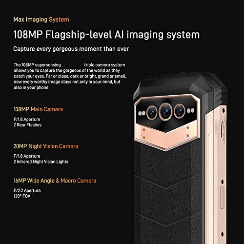 【Fotocamera Quad AI da 108 MP + 20 MP + 16 MP + impronte digitali e sblocco facciale】 DOOGEE V MAX viene fornito con un livello di configurazione Al a quattro fotocamere Ciò significa che la fotocamera principale avrà 108 MP e catturerà chiaramente i tuoi momenti preferiti. L'obiettivo ultra-angolare da 130°, l'obiettivo macro e il sensore di profondità assicurano i migliori risultati. La fotocamera frontale Samsung da 32 MP ti offre foto più nitide e ad alta risoluzione.