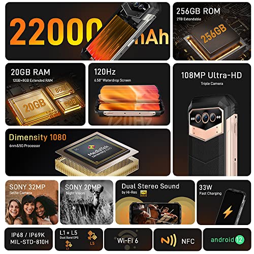 DOOGEE VMAX 5G Rugged Smartphone, 22000mAh Batteria, Dimensity 1080 20GB+256GB, 6.58'' FHD+, 108MP Triple AI Fotocamera (20MP Visione Notturna)+ 32MP, Android 12 Cellulare Impermeabile, NFC Nero