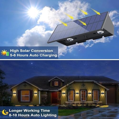 Applique LED da Esterno a Parete dotata di Pannello Solare Integrato. Questa elegante lampada solare è progettata per creare un suggestivo effetto up&down con due distinti fasci di luce, sia sopra che sotto, trasformando ogni spazio esterno in un'opera d'arte illuminata. La ricarica solare rapida, si completa in sole 6 ore. Con due modalità di funzionamento, potrai personalizzare l'atmosfera in base alle tue esigenze.