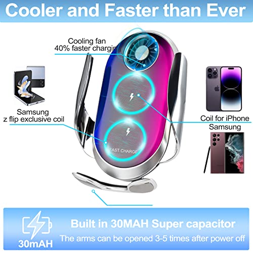 15W Doppia Bobina Caricatore Wireless Auto - Aggiornate a doppie bobine creano un'area di ricarica più ampia per i telefoni, assicurandosi che la bobina di ricarica del telefono sia allineata con l'area di ricarica del monte del caricatore. La parte inferiore della bobina è appositamente progettata per Galaxy Z Flip 4/3/2. Questo caricatore del telefono wireless Qi con chip intelligente integrato può proteggere il telefono da sovraccarico, corrente, corto circuito, a temperatura elevata, ecc.