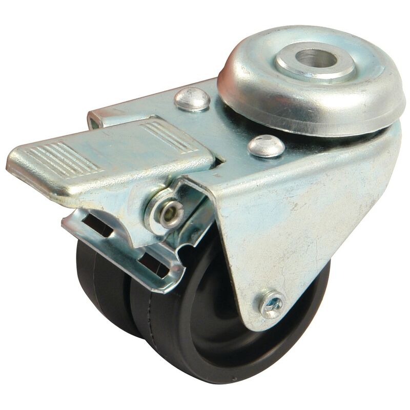Ruota doppio rullo 50mm perno piastra tonda.con freno Ruota in acciaio zincato. - Fissaggio degli occhi. - Ruota in poliammide nera, freno a doppio effetto (ruota e girevole). - Per mobili, espositori, quadri elettrici.