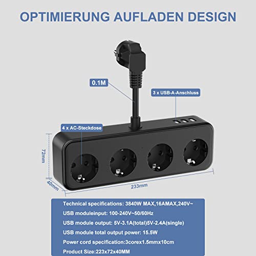 Design di ricarica ottimizzato: queste prese USB utilizzano tecnologie più avanzate per ottimizzare ogni ricarica. Presa AC: max. Potenza fino a 3840 Watt (max. 240 V, 16 A. Tensione di ingresso delle porte USB: 100 V - 240 V AC, 50/60 Hz, uscita USB: 5 V/3,1 A (totale), 5 V/2,4 A (singola connessione). Può rilevare automaticamente il tuo dispositivo e distribuire energia.
