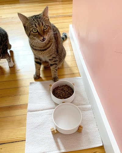 Doppie ciotole in ceramica per gatti e cani di piccola taglia da 12.8cm l'una in bambù, 2x400ml rialzate e sollevate da terra con base antiscivolo (DOPPIE 12.8 CM, BIANCO)