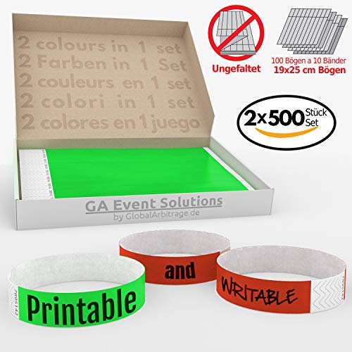 Doppio Pacchetto! GA Event Solutions Braccialetti di identificazione Tyvek, Verde + Rosso, 500+500 pezzi