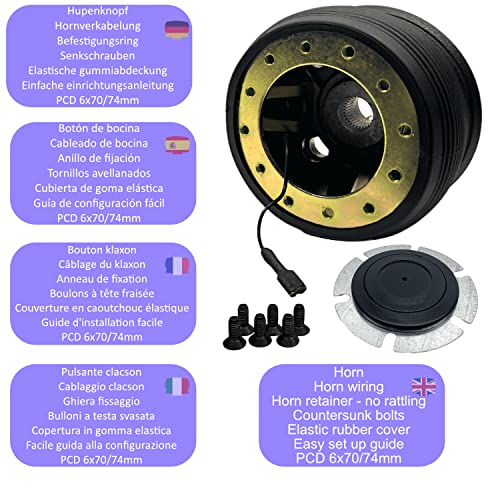 Alta qualità materiali, adatto con ogni volante, facile installazione, Istruzioni sulla scatola, nonché fili e viti. Pulsante clacson incluso.