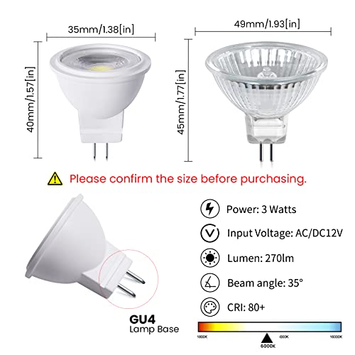 Lampadine LED MR11 a bassa tensione - Lampadine LED MR11 GU4, base GU4, AC/DC 12V, 3 Watt, bianco freddo 6000K, 270lm, angolo di emissione 35°. Nota: questa lampadina è a bassa tensione a 12 V, verificare il proprio voltaggio prima dell'acquisto.