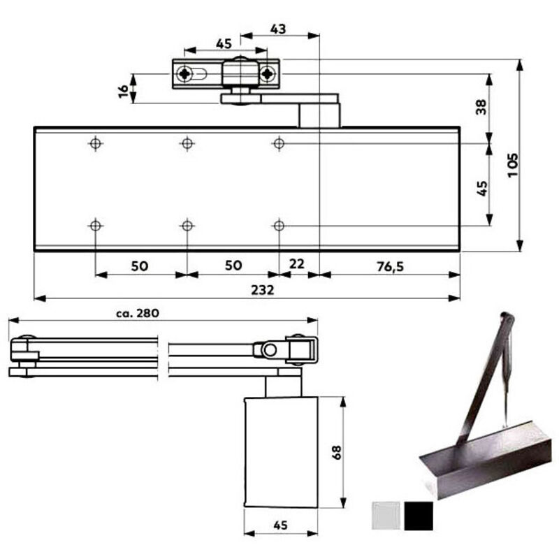 Corpo monoblocco acciaio - Custodia ABS Regolazione forza chiusura EN 2/4 Regolazione velocita' chiusura e forza colpo Porte destre e sinistre a battente Omologato porte tagliafuoco e tagliafumo Porte cm 110 - Senza braccetto Lunghezza mm 232 - Profondita' mm 45