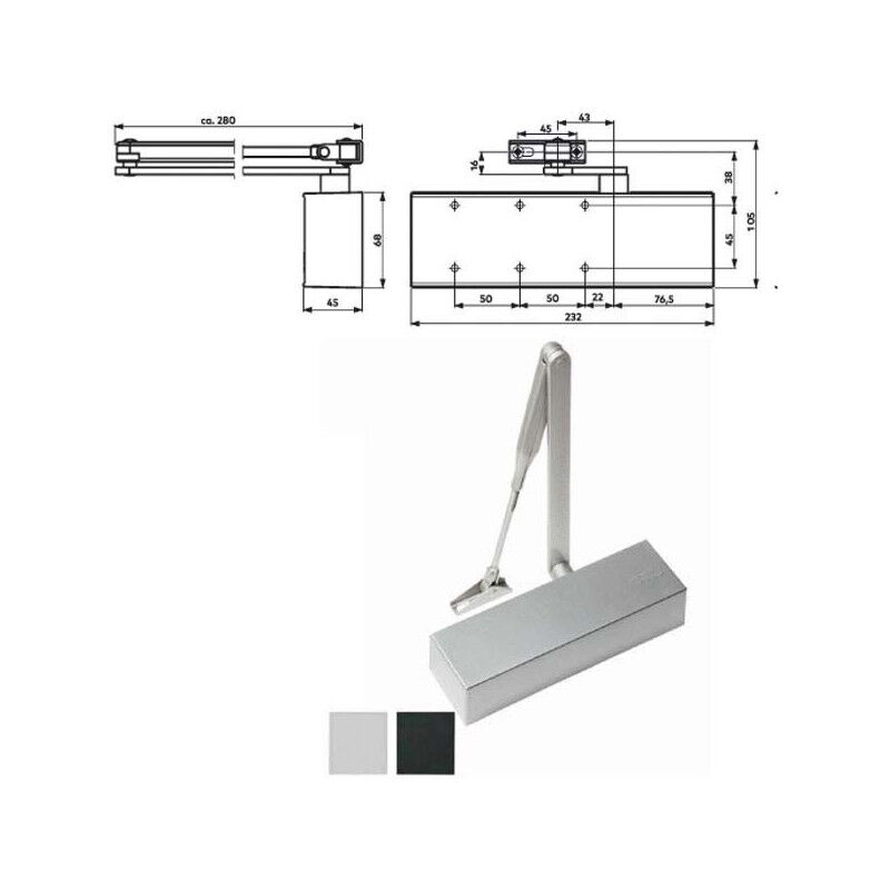 Corpo monoblocco acciaio - Custodia ABS Braccettoacciaio senza arresto Regolazione forza chiusura EN 3/4 Regolazione velocita' chiusura e forza colpo Porte destre e sinistre a battente Omologato porte tagliafuoco e tagliafumo Porte cm 110 Lunghezza mm 232 - Profondita' mm 45 Dotazione piastra montaggio
