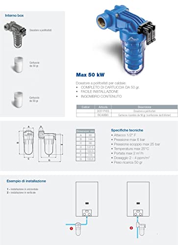 Dosatore a polifosfati per caldaie: ? COMPLETO DI CARTUCCIA DA 50 gr. ? FACILE INSTALLAZIONE ? INGOMBRO CONTENUTO ? POSSIBILITÀ DI INSTALLAZIONE ORIZZONTALE E VERTICALE ? ATTACCO 1/2 ?' FEMMINA