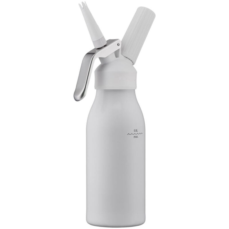 Siringa per panna montata Kayser Style Materiale: alluminio Contenuto: 0,5 litri La bottiglia riempita può essere conservata in verticale in frigorifero (min + 1°C) Il contenuto rimane fresco per 10 giorni 2 ugelli diversi Le cartucce di panna montata non sono incluse Le cartucce di panna montata sono riciclabili Lavabile in lavastoviglie