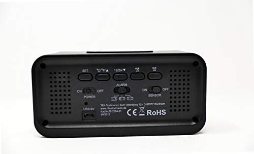 TFA Dostmann BOXX - Sveglia digitale a radiofrequenza, con temperatura interna, ricaricabile tramite USB, in plastica, nero, 142 x 45 x 73 mm (L x L x A)