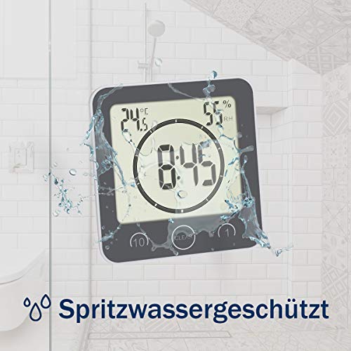 TFA Dostmann Orologio da bagno/cucina con timer, 60.4001.10, fissaggio senza foratura, tempo fino a 99 minuti, resistente agli spruzzi, incl. termoigrometro, grigio, (L) 106 x (L) 41 (52) x (H) 109 mm