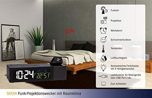 TFA Dostmann - Orologio Show con proiezione radio e temperatura, in plastica, colore: nero, 170 x 110 x 110 mm (lunghezza x larghezza x altezza)