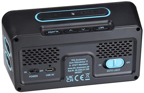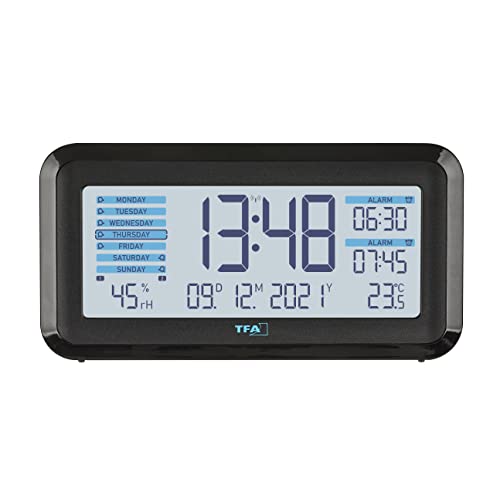 TFA Dostmann Sveglia digitale radiocontrollata BOXX2, 60.2562.01.GB, da comodino, due sveglie attivabili separamente, con termoigrometro, nero