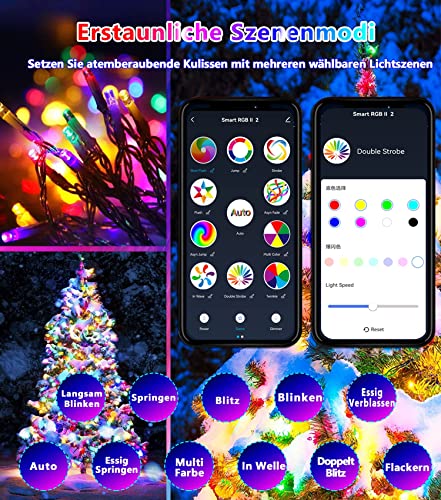 16 milioni di colori e 11 modalità di illuminazione, 2 m, 400 LED, catena luminosa natalizia. Una striscia di catene luminose intelligenti può mostrare contemporaneamente diversi colori come un arcobaleno. 11 tipi di modalità di illuminazione sono adatti per diverse occasioni.