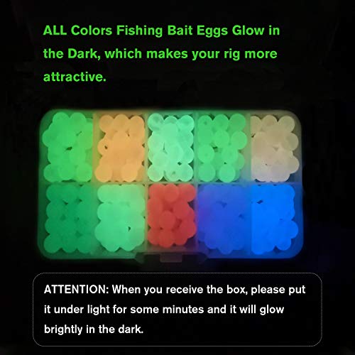 BELLA VARIETÀ DI COLORI E DIMENSIONI DA SCEGLIERE: Bella varietà di colori e dimensioni tra cui scegliere. L'assortimento comprende 10 colori. 3 dimensioni di diametro: 0.24in/6mm * 600pcs, 0.31in/8mm * 250pcs, 0.38in/10mm * 120pcs. Tutti i colori delle uova esca da pesca brillano al buio.