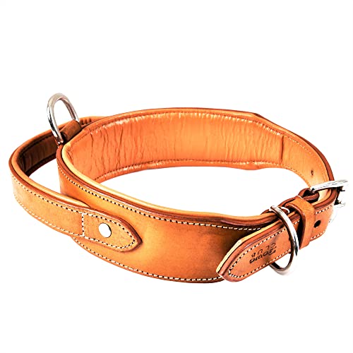 DowgClub | Collare tattico per cani con maniglia, vera pelle di grado sella, resistente, comodo, imbottito, forte, ideale per razze medie, grandi e XL (L (misura collo 47 - 57 cm), marrone chiaro)