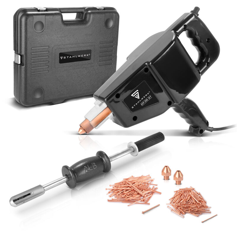 Caratteristiche Con una potenza di 3.800 watt, la saldatrice a punti STAHLWERK DP-38 ST è ideale per la riparazione professionale delle carrozzerie. Dotato di un set completo di accessori, tra cui un martello a slitta per tutte le applicazioni più comuni, il saldatore a punti di alta qualità assicura sempre un risultato di lavoro pulito e preciso quando si rimuovono ammaccature, ammaccature e altri danni alla lamiera. Il sollevatore di ammaccature convince per la sua maneggevolezza quando si lavora su parti sottili della carrozzeria come parafanghi, cofani o tetti delle auto. Il versatile smacchiatore Smart Repair sta bene in mano, ha un'impugnatura ergonomica e consente di lavorare comodamente. Ciò significa che i chiodi a saldare possono essere saldati senza sforzo anche durante i cicli di lavoro più lunghi. Lo smacchiatore per carrozzerie funziona tramite l'alimentazione di rete convenzionale a 230 V e può essere collegato a qualsiasi presa di corrente. Il design compatto e il peso