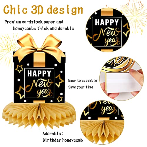 DPKOW Festa Capodanno 2024 Centrotavola a nido d'Ape Oro Nero Buon Anno Tema Topper da tavola Oro Nero Centrotavola Carta Capodanno per 2024 Forniture Decorazione della Festa Capodanno,9 Pezzi