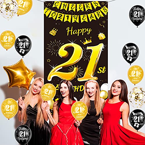 【21 Anni Compleanno Striscione】La confezione include: 1 striscione di buon 21 anni compleanno in tessuto oro nero (6,07 * 2,95 piedi / 185 * 90 cm), corda (19,6 piedi / 6 m). Grande oro nero 21 compleanno porta striscione ideale per la decorazione 21 anni compleanno, decorazione per sfondo in oro nero per il 21 anni compleanno, decorazione per la porta del 21 anni compleanno in oro nero.
