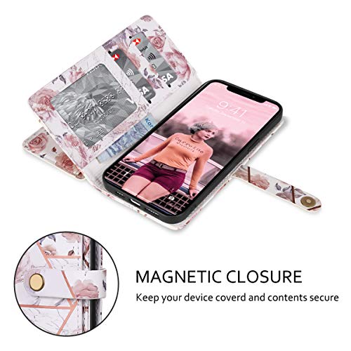 Dracool Cover per iPhone 12/ iPhone 12 PRO 5G (6.1 Pollice) Custodia a Portafoglio Pelle Premium per Donne con 10 Porta Carte Wallet Case con Fiore Libro Magnetica Flip Silicone - Marmo Oro Rosa