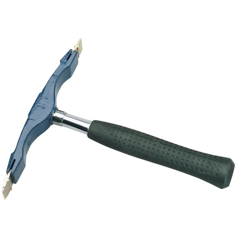 Descrizione Double-ended forged scutch hammer,Comes with one each of 25 mm plain and comb scutches,Hardened chrome steel shaft,Comfortable shock-absorbing rubber grip