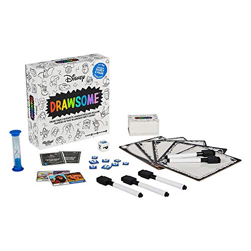 Drawsome viene fornito con 5 tavole da disegno facili da pulire, 95 carte da gioco, 5 penne, dadi, timer di sabbia e istruzioni complete per il gioco