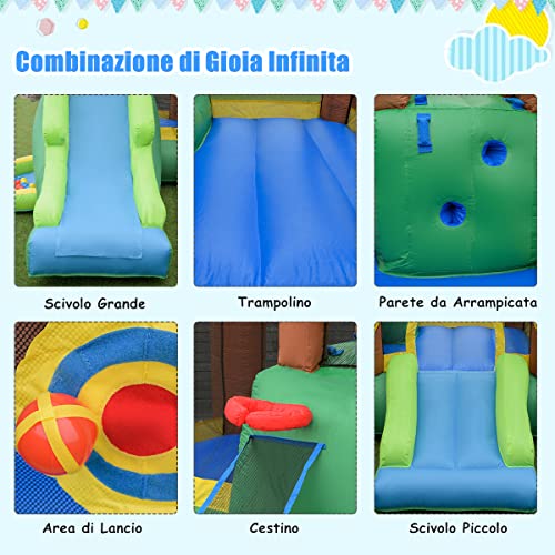 Enorme Area Giochi e Molteplici Opzioni - Il castello gonfiabile ha un'area per saltare, 2 scivoli, una piscina di palline oceaniche, un canestro, un rete per lancio, un trampolino, 2 palline di velcro e 30 palline oceaniche. I bambini possono giocare a pitching, giocare a palline oceaniche e saltare liberamente con i loro amici, che possono esercitare le loro capacità atletiche e portare loro una felicità infinita.