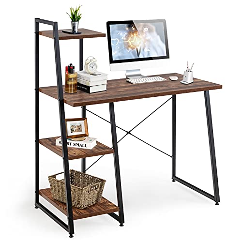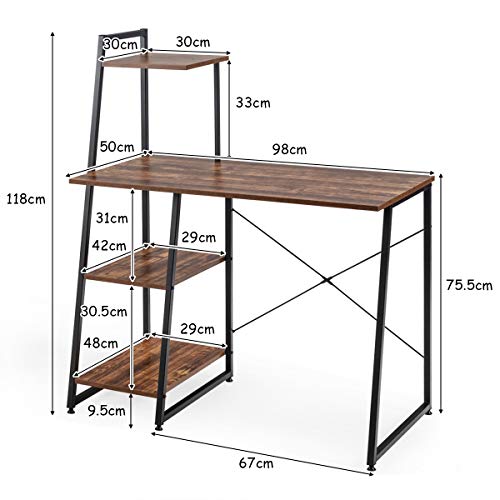 DREAMADE Scrivania con Libreria a 4 Ripiani,Scrivania per Computer con Scaffale Laterale, Scrivania con Libreria per Ufficio,Studio,Camera da Letto,Struttura in Ferro,Bianco,100x50x118cm (Marrone)