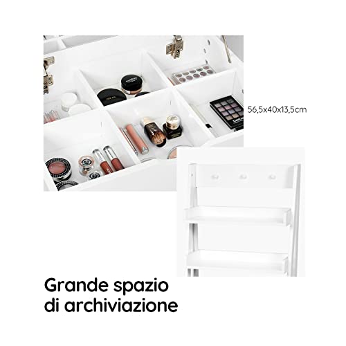 Spazio di archiviazione sufficiente - La nostra toeletta ha due ripiani, un ampio scomparto che può essere aperto, puoi mettere i tuoi cosmetici, bellezza, come orecchini, gioielli, anelli, rossetto, ecc, la nostra toeletta ti dà molto spazio per soddisfare le tue esigenze quotidiane di trucco.