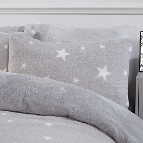 Dreamscene Set di biancheria da letto con federa in pile termico con stampa a stelle e soffice, grigio argento/bianco, super king