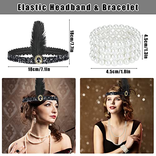 Accessori anni '20 per donne: riceverete un totale di 9 pezzi: 1 fascia per capelli anni '20, 1 paio di orecchini vintage (2 pezzi), 1 paio di guanti in raso elastici (2 pezzi), 1 supporto in plastica, 1 collana di perle Charleston, 1 braccialetto di perle finte e 1 scomparto in pizzo.